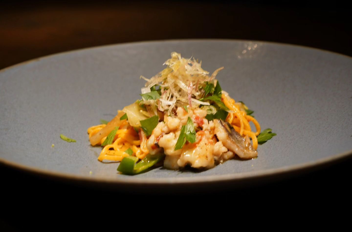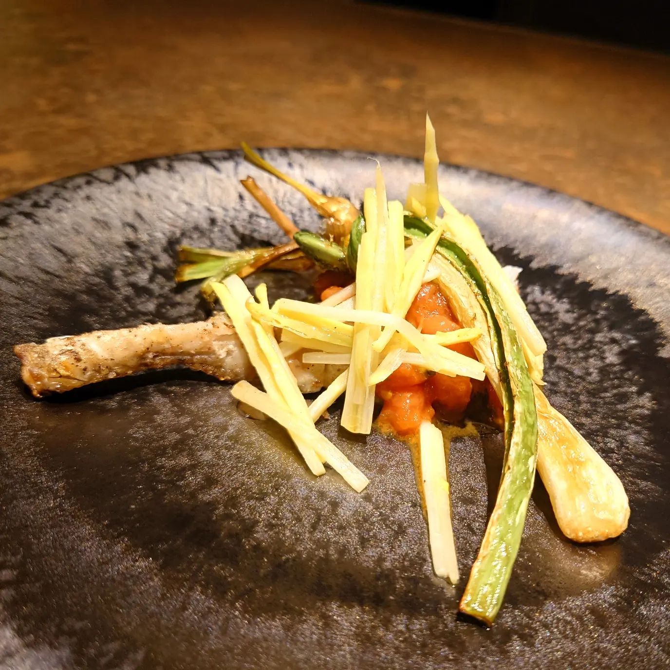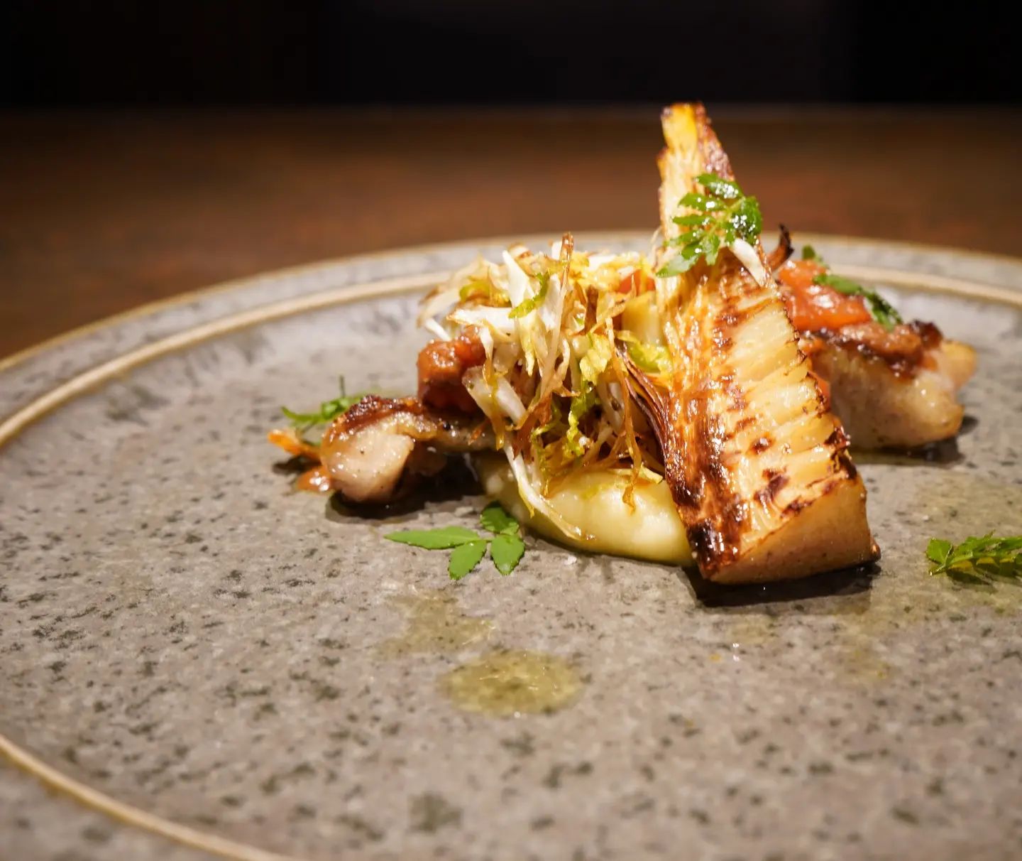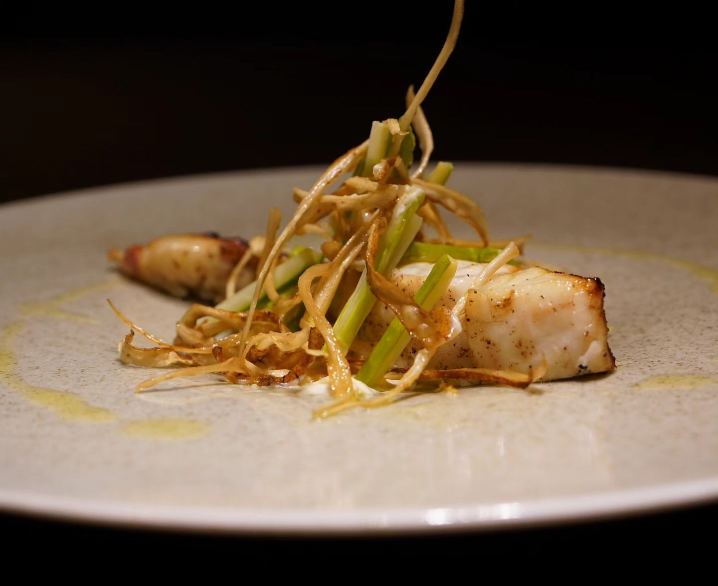 香ばしく炭焼きした旬のクエと組み合わせたのは